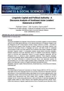 Sahar, Rafidah and Samsuddin, Sitti Nuratika (2026) Linguistic capital and political authority: a discourse analysis of southeast Asian leaders’ statement at COP29. International Journal of Academic Research in Business and Social Sciences, 16 (2). pp. 430-447. E-ISSN 2222-6990