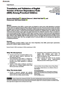 Abdul Hadi, Azwanis and Zainoren, Nadirah and Said, Abdul Hadi and Zainal Abidin, Muhammad 'Adil (2026) Translation and validation of English version of screen dependency scale (SDS) among preschool children. Journal of Primary Care and Community Health (JPC), 17 (1). pp. 1-11. ISSN 2150-1319 E-ISSN 2150-1327