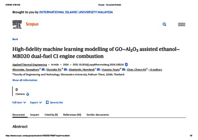 Klinmalee, Tossaphorn and Elumalai, P.V. and Alwetaishi, Mamdooh and Hussain, Fayaz and Chan, Choon Kit and Reddy, M. Venkateswar and Khan, Sher Afghan and Keçebas, Ali (2026) High-fidelity machine learning modelling of GO–Al₂O₃ assisted ethanol–MBD20 dual-fuel CI engine combustion. Applied Thermal Engineering, 291 (NA). pp. 1-31. ISSN 1359-4311 E-ISSN 1873-5606