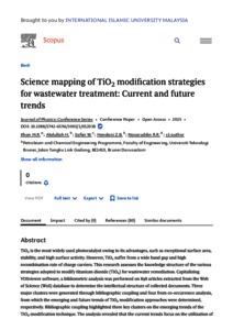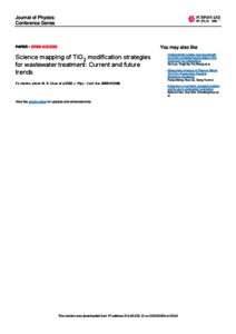clusters were generated through bibliographic coupling and four from co-occurrence analysis, from which the emerging and future trends of TiO2 modification approaches were determined, respectively. Bibliographic coupling highlighted three key clusters on the emerging trends of the TiO2-modification technique. The analysis revealed that the current trends focus on the utilization of copper-based dopants in TiO2, demonstrating improved charge isolation and visible light activation. The second cluster underscores the noble metal doping, with gold and silver compounds leveraging localized surface plasmon resonance (SPR) properties. The third cluster explores graphene-based codoping strategies. Co-occurrence analysis of 56 high-frequency keywords revealed four thematic clusters centres on nanocomposites for pollutant treatment, integration of adsorption, photocatalysis and advanced thin-film deposition techniques. The significance of this study lies in its potential to guide researchers in exploring identified nanocomposite materials and techniques to enhance the efficiency and properties of TiO2 for the photodegradation of organic molecules in wastewater.
