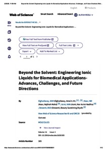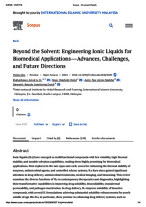 Elgharbawy, Amal A.M. and Mohd Noor, Najihah and Azmi, Nor Azrini Nadiha and Dewanti, Beauty Suestining Diyah (2026) Beyond the solvent: engineering ionic liquids for biomedical applications—advances, challenges, and future directions. Molecules, 31 (2). pp. 1-31. ISSN 1420-3049