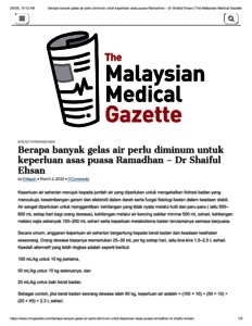 Shalihin, Mohd Shaiful Ehsan (2026) Berapa banyak gelas air perlu diminum untuk keperluan asas puasa Ramadhan. The Malaysian Medical Gazette, NA (NA). NA-NA.