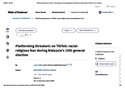 Mohamad Jamil, Siti Nurnadilla (2026) Platforming threatoric on TikTok: racial‑religious fear during Malaysia’s 15th general election. Discourse, Context & Media, 71 (NA). pp. 1-15. ISSN 2211-6958 E-ISSN 2211-6966