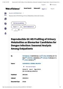 Abd. Rahman, Izzat Zulhilmi and Wan Omar, Wan Fatein Nabeila and Abdullah, Aszrin and Ahmad, Hajar Fauzan and Amid, Azura (2026) Reproducible GC–MS profiling of urinary metabolites as biomarker candidates for dengue infection: seasonal analysis among outpatients. IIUM Medical Journal Malaysia, 25 (2). pp. 135-141. ISSN 1823-4631 E-ISSN 2735-2285