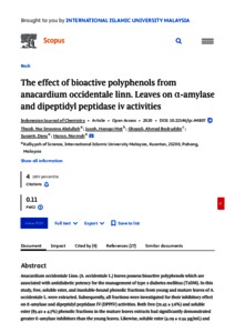 Abdullah Thaidi, Nur Imanina and Mat Jusoh, Hanapi and Ghazali, Ahmad Badruddin and Darnis, Deny Susanti and Haron, Normah (2020) The effect of bioactive polyphenols from anacardium occidentale linn. Leaves on α-amylase and dipeptidyl peptidase iv activities. Indonesian Journal of Chemistry, 20 (5). pp. 1010-1017. ISSN 1411-9420 E-ISSN 2460-1578
