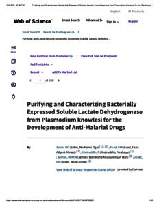 Ogu Salim, Nurhainis and Ahmad Fuad, Fazia Adyani and Khairuddin, Farahayu and Wan Seman, Wan Mohd Khairulikhsan and Jonet, Mohd Anuar (2021) Purifying and characterizing bacterially expressed soluble Lactate Dehydrogenase from Plasmodium knowlesi for the development of anti-malarial drugs. Molecules, 26 (21). pp. 1-13. E-ISSN 1420-3049