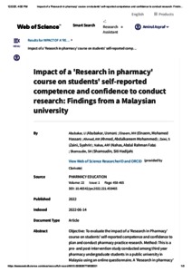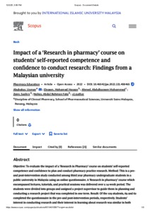 Abubakr, Usman and Elnaem, Mohamed Hassan Abdelaziz and Ahmed, Abdulkareem Mohammed and Zaini, Syahrir and Nahas, Abdul Rahman Fata and Shamsudin, Siti Hadijah (2022) Impact of a ‘Research in pharmacy’ course on students’ self-reported competence and confidence to conduct research: findings from a Malaysian university. Pharmacy Education, 22 (1). 458 -465. ISSN 1560-2214 E-ISSN 1477-2701