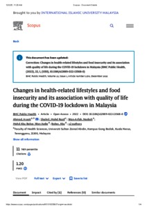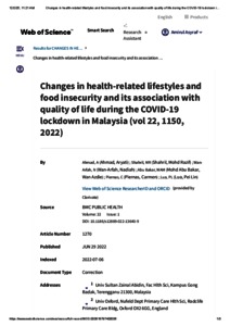Ahmad, Aryati and Shahril, Mohd Razif and Wan‑Arfah, Nadiah and Mohd Abu Bakar, Wan Azdie and Piernas, Carmen and Lua, Pei Lin (2022) Changes in health‑related lifestyles and food insecurity and its association with quality of life during the COVID‑19 lockdown in Malaysia. BMC Public Health, 22 (1150). pp. 1-9. E-ISSN 1471-2458