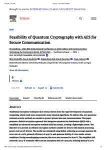 Mustaffa, Nurul Muzfirah and Mat Daud, Nurulain Balqis and Sase, Takumi (2026) Feasibility of quantum cryptography with AES for secure communication. In: 10th International Conference on Information & Communication Technology for the Muslim World (ICT4M 2025), 26-27 November 2025, Kulliyyah of Information & Communication Technology (KICT), International Islamic University Malaysia, 53100 Kuala Lumpur, Malaysia.