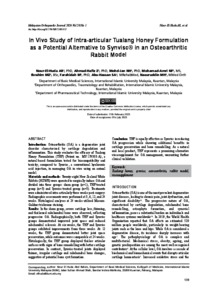 Abd. Rahim, Nour El Huda and Zulkifly, Ahmad Hafiz and Mohd Jan, Nurul Hafiza and Mohamad Amri, Nur Fathonah and Ibrahim, Mohd Zulfadzli and Mohamed, Farahidah and Abu Hassan, Salmah Anim and Nasuruddin, Muhammad Haidar (2026) In Vivo study of intra-articular Tualang honey formulation as a potential alternative to Synvisc® in an osteoarthritic rabbit model. Malaysian Orthopaedic Journal, 20 (1). pp. 139-148. ISSN 1985-2533 E-ISSN 2232-111X