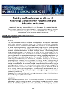 Sadeq, Abdallah I A and Juhdi, Nurita and Abdul Hamid, Zabeda (2026) Training and development as a driver of knowledge management in Palestinian higher education institutions. International Journal of Academic Research in Business and Social Sciences, 16 (4). pp. 498-510. E-ISSN 2222-6990