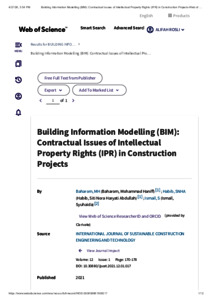 Building Information Modelling (BIM) is an emerging technology that provides a platform for a comprehensive digital representation of a facility to be created by integrating data from design conception until demolition. In seeking the optimum use of BIM, a large degree of cooperation and collaboration among multi-disciplinary contributors are required for the digital data exchange and sharing process to be deployed. This situation, however, brings up new issues in delineating liabilities and limitations of contributors as the demarcation line of each contributor becomes unclear. In Malaysia, there is no known BIM-enabled standard form of contract that preserves the intellectual property rights (IPR) of the BIM projects’ contributors. Therefore, the present study attempts to investigate the issues pertaining to IPR in the context of BIM adoption in the construction project. Qualitative methodology involving literature review, analysis of existing IPR provisions and semi-structured interviews with the experts were conducted. The research identified two major issues related to IPR in BIM projects: copyright ownership of the BIM model and data infringement. This paper is substantial to deliver knowledge to the construction industry practitioners regarding the legal and contractual considerations in the adoption of BIM